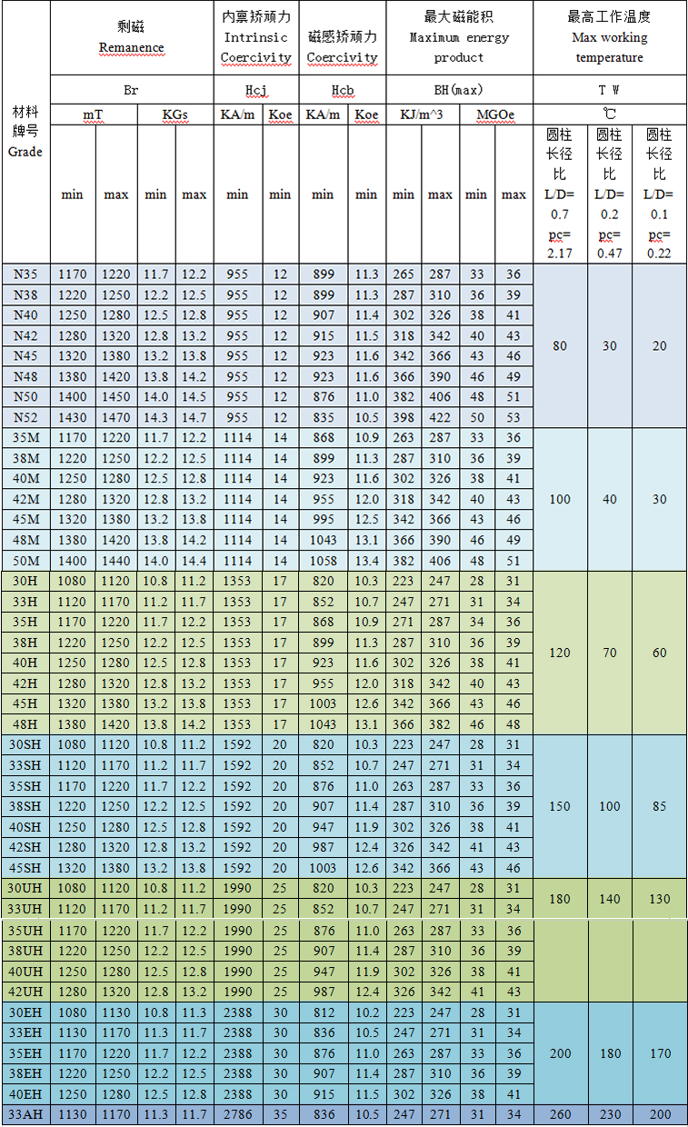 其實,高溫磁力輪和常溫磁力輪的區別,是磁力輪所用磁環的材料牌號有區別。釹鐵硼磁鐵根據其矯頑力不同,會有很多的牌號。如下圖。