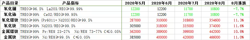 8月11日,北方稀土公布8月輕稀土掛牌價格偏強(qiáng),鐠釹、釹系產(chǎn)品價格大幅上調(diào)。鐠釹金屬和氧化物、以及金屬釹和氧化物漲幅都在10-11%左右,金屬鐠釹達(dá)44.2萬元/噸,具體價格如下表。
