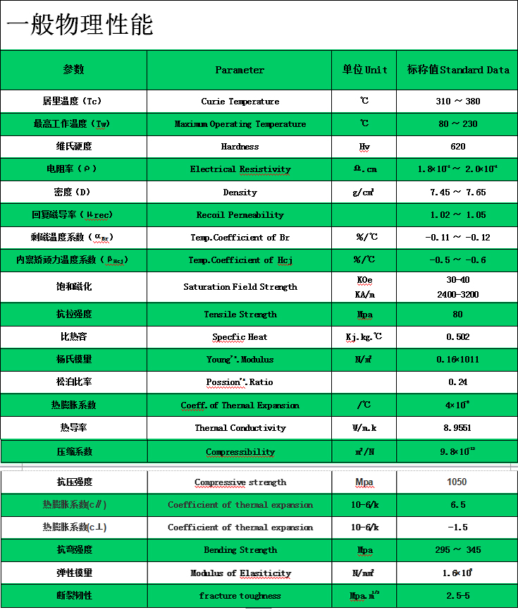 釹鐵硼永磁鐵一般物理性能: